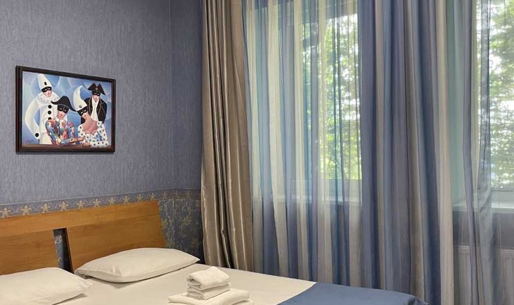 В номере: диван, зеркало, кровать двуспальная, прикроватные тумбочки, стол, стулья, кондиционер, мини-холодильник, сейф, телевизор ЖК, телефон