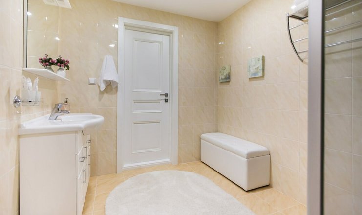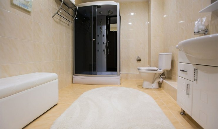 Санузел: с душевой кабиной, тапочки, туалетные принадлежности, фен
